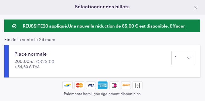 Le code promo REUSSITE20 sera automatiquement appliqué et vous obtiendrez vos places à -20%, comme sur le screenshot ci-dessous.